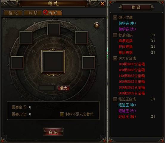 合成,可以合成保护符、特戒、BOSS令、经验玉4种道具,只要收集足够的道具后,就可以在这里进行合成,合成需要消耗金币。