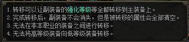 转移,左键点击放入主装备和副装备,消耗金币可以将副装备的强化等级转移到主装备上,只有同部位的装备才能转移。