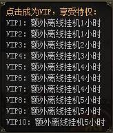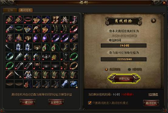 离线挂机:此功能是《传奇荣耀》的特色玩法,每位玩家每天有5小时的离线挂机时间(每天0点刷新),当玩家离线后自动进入离线挂机状态,在离线挂机状态中,玩家不仅能获得经验,而且能够获得相当于在线状态下击杀怪物拾取的装备和材料。当玩家重新上线后可以在福利系统中领取离线经验及离线挂机获得的装备和材料,玩家可以选择免费领取或者花费元宝2倍领取。成为VIP后,即可获得额外的离线挂机时间,工作、游戏两不误。