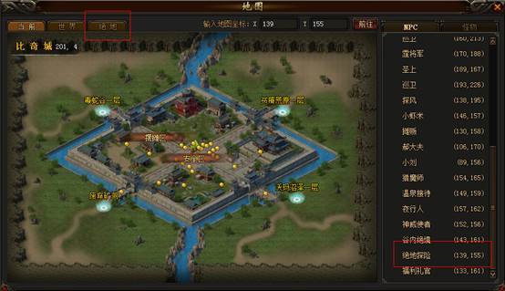 在比奇城中,隐藏着一位去过绝地的强大冒险者,在他的口中,能够获得关于“绝地”的信息。