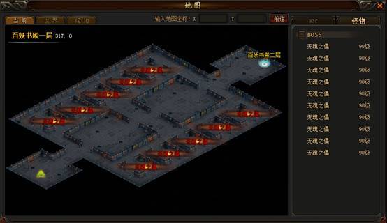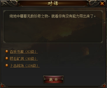 打开绝地系统,可以看到,绝地共分为:“百妖书殿”、“陨石矿洞”、“上古战场”三个部分,只有达到等级要求的角色,才能进入。