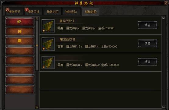 屠龙战纹与屠龙神装一样,可以通过点击屠龙神装图标,进入战纹进阶界面进行升级。