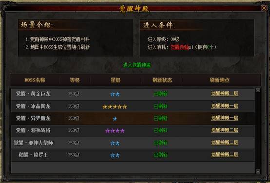 BOSS为全新BOSS,会在固定点刷新,玩家可通过觉醒神殿NPC查看当前BOSS刷新数量并前往击杀。