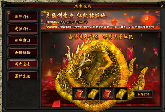 规则:活动期间,每天17:00可前往击杀周年金龙,击杀后会掉落大量周年红包