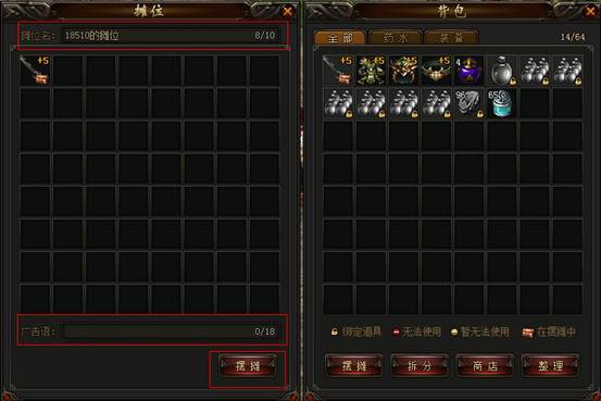 将物品放入摊位后,可以选择修改摊位名(系统默认摊位名为“XXXX的摊位”)、输入有吸引力的广告语后,点击摊位界面中的“摆摊”,