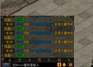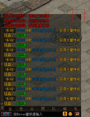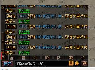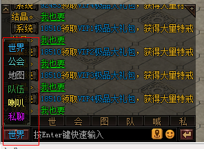 在游戏的左下方,可以看到《传奇荣耀》中的聊天框,在《传奇荣耀》中,聊天框分为“全部频道”、“世界频道”、“公会频道”、“地图频道”、“组队频道”、“喊话频道”、“私聊频道”7个频道,点击相应频道即可查询相应频道内的信息。