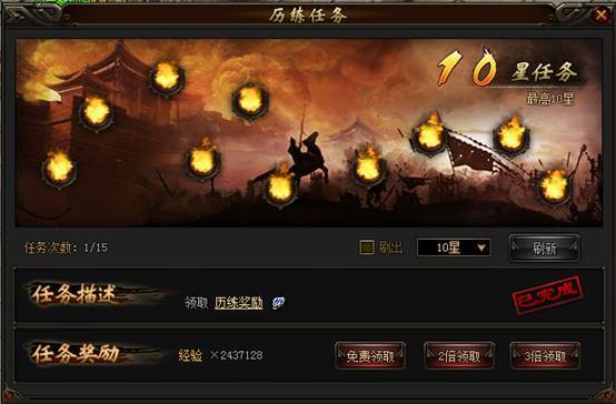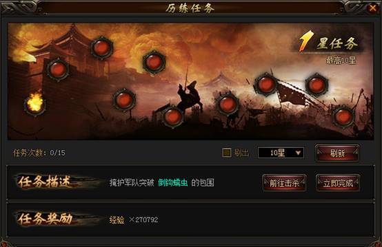 历练任务共分10星,1星奖励最低,10星奖励最高,可以通过消耗金币刷新到10星任务,
