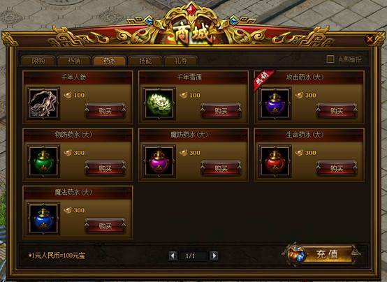 药水商城中出售的是有时效性的辅助道具,打宝PK必备良药,