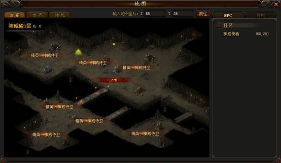 在比奇城中,有一位“神威使者”,找到他即可传送进入神威殿。