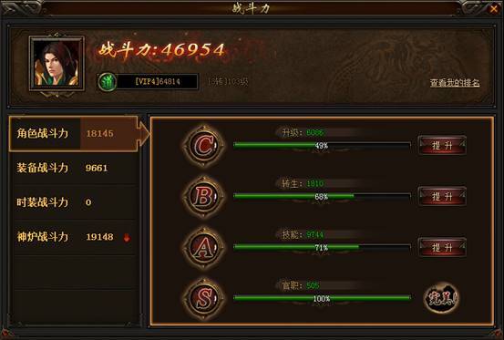 点击“提升”就可以打开相应的界面,进行提升,点击“查看我的排名”,即可打开排行榜,看到自己在全服中的排行,