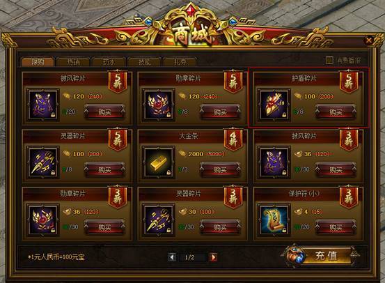 护盾共分20级,护盾的等级越高,物理和魔法防御能力越高。低级护盾可以消耗“护盾碎片”和金币升级到高级护盾。“护盾碎片”可以在限购商城和礼券商城中用礼券购买。