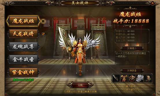 在战神系统中,共有五位美女战神等待您的召唤:“魔龙战姬”、“天龙战将”、“龙魂战尊”、“金牛战圣”、“紫金战神”,战神等级越高战斗力越高。