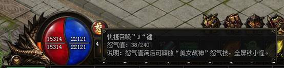 战神在打怪的过程中,能够积攒“怒气”,当“怒气值”满后可释放怒气技,秒杀全屏小怪。