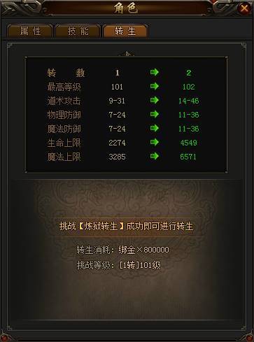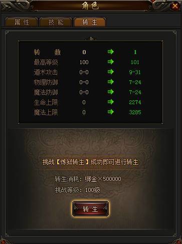 当等级达到上限后必须通过转生才能开启新的等级上限,转生是所有传奇修行之人都必须经历的过程,只有战胜自己的黑暗面才能顺利转生!
