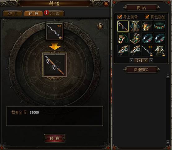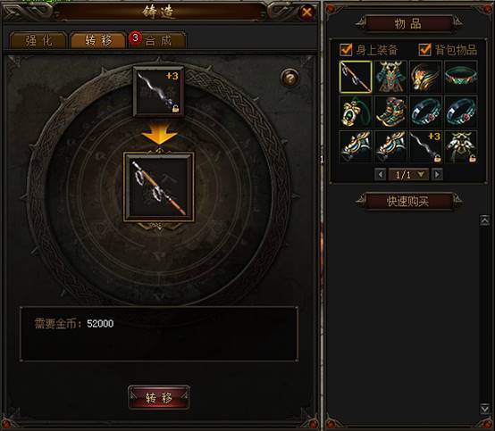 转移,左键点击放入主装备和副装备,消耗金币可以将副装备的强化等级转移到主装备上,只有同部位的装备才能转移。
