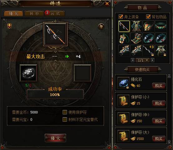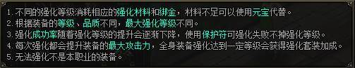 强化,左键点击需要强化的装备放入强化界面中,消耗“强化石”和金币,即可开始强化。强化有成功率,强化等级越高,成功率越低,强化失败,强化等级会降低,使用保护符,可以保护您在强化失败后,强化等级不降低。