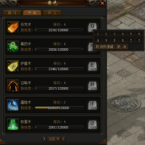 玩家可以在此界面中查看角色的技能等级,并且可以点击技能右侧的按钮设置快捷按键。