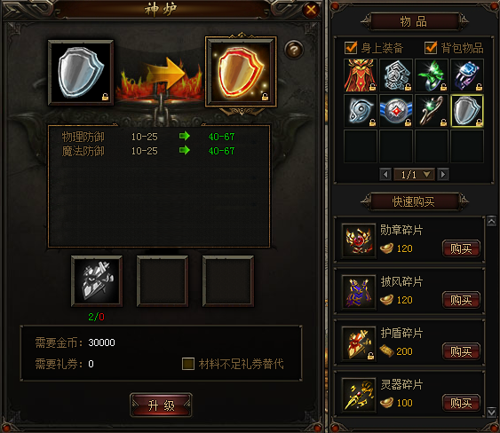在神炉系统中,可以升级“披风”、“勋章”、“护盾”、“灵器”、“特戒”,并且在神炉中,可以快速购买所需要的材料,升级真方便。