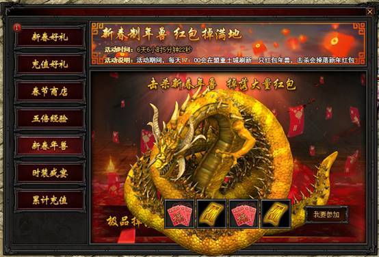 规则:活动期间,每天17:00可前往击杀红包年兽,击杀后会掉落大量新年红包