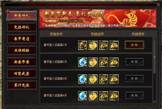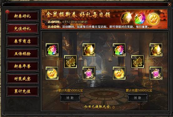 规则:活动期间,玩家每日充值达标可领取奖励,每日重置