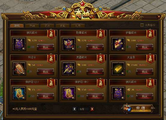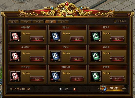 在《传奇荣耀》的商城中,分有5个子项:“限购”、“热销”、“药水”、“技能”、“礼券”。