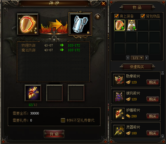 护盾共分20级,护盾的等级越高,物理和魔法防御能力越高。低级护盾可以消耗“护盾碎片”和金币升级到高级护盾。“护盾碎片”可以在限购商城和礼券商城中用礼券购买。